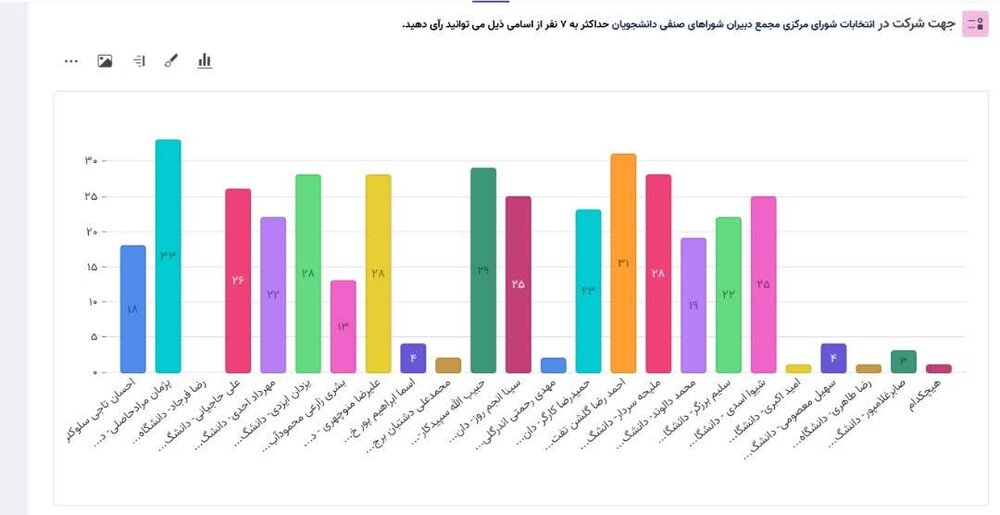 ۱.پژمان مرادحاصلی ۳۳ رای۲.احمدرضا گلشن ۳۱ رای۳.حبیب اله سپیدکار ۲۹ رای۴.یزدان ایزدی ۲۸ رای۵.علیرضا منوچهری ۲۸ رای۶.ملیحه سردار ۲۸ رای۷.علی حاجیانی ۲۶ رای
