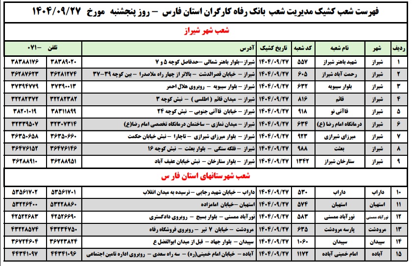 فهرست شعبه های کشکیک بانک رفاه کارگران استان فارس در روز پنج شنبه، مورخ 27 آذر 1404 منتشر شد.