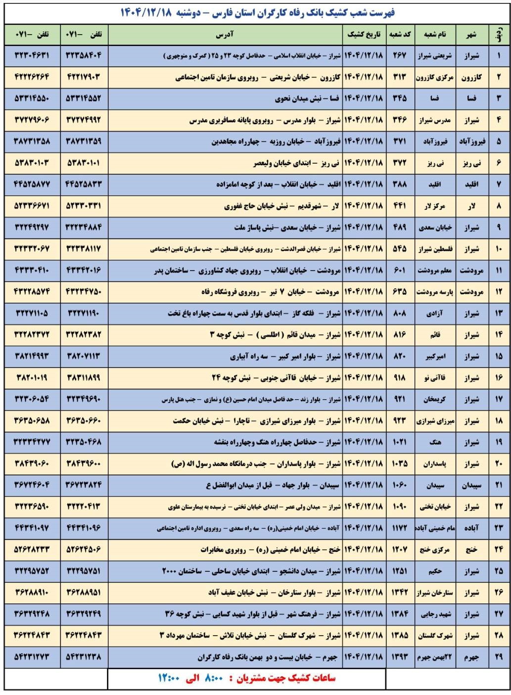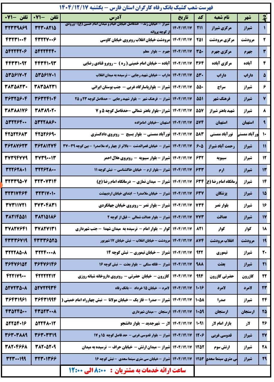 لیست شعب کشیک بانک رفاه کارگران استان فارس را در روزهای 17 و 18 اسفند