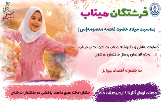 به مناسبت دهه کرامت و به بهانه میلاد حضرت فاطمه معصومه(س) و روز دختر، کانون بسیج جامعه پزشکی دانشگاه در نظر دارد «مسابقه نقاشی و دل نوشته خطاب به فرشتگان آسمانی میناب»، ویژه فرزندان کارکنان ساختمان مرکزی را همراه با اهدای جوایز برگزار نماید.
