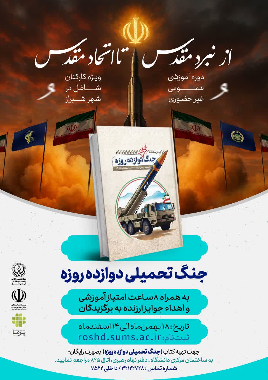 دوره آموزشی «جنگ تحمیلی دوازده روزه» با عنوان «از نبرد مقدس تا اتحاد مقدس» بهصورت عمومی و غیرحضوری ویژه کارکنان شاغل در شهر شیراز برگزار میشود.