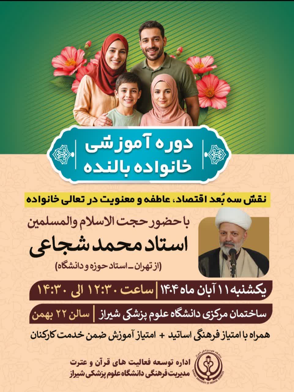 دوره آموزشی خانواده بالنده (نقش سه بُعد اقتصاد، عاطفه و معنویت در تعالی خانواده) ویژه اساتید، کارکنان و دانشجویان برگزار می شود.