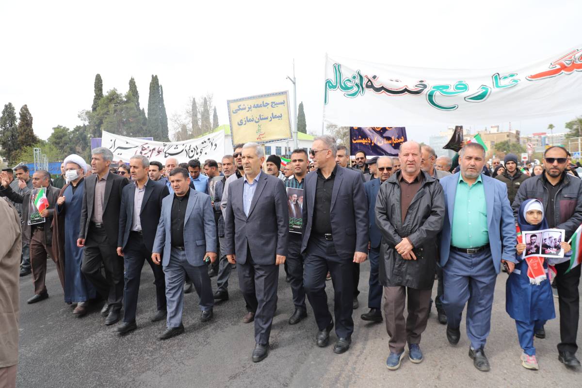 رئیس حوزه ریاست دانشگاه علوم پزشکی شیراز نیز اظهار کرد:  روز جهانی قدس یادگار جاویدان امام خمینی(ره) است که با درایت ایشان به عنوان نماد وحدت امت اسلامی در حمایت از مردم مظلوم فلسطین نام‌گذاری شد و این آرمان تاکنون نیز با قدرت ادامه دارد.