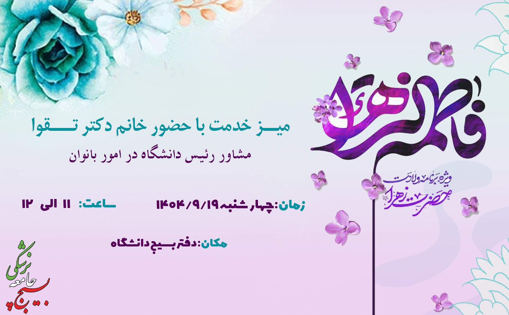 با توجه به آغاز هفته گرامیداشت مقام زن و میلاد با سعادت حضرت زهرا(سلام الله علیها)، میز خدمت با حضور دکتر «تقوا» مشاور رئیس دانشگاه در امور بانوان، به همت کانون بسیج دانشگاه علوم پزشکی شیراز برگزار می شود.