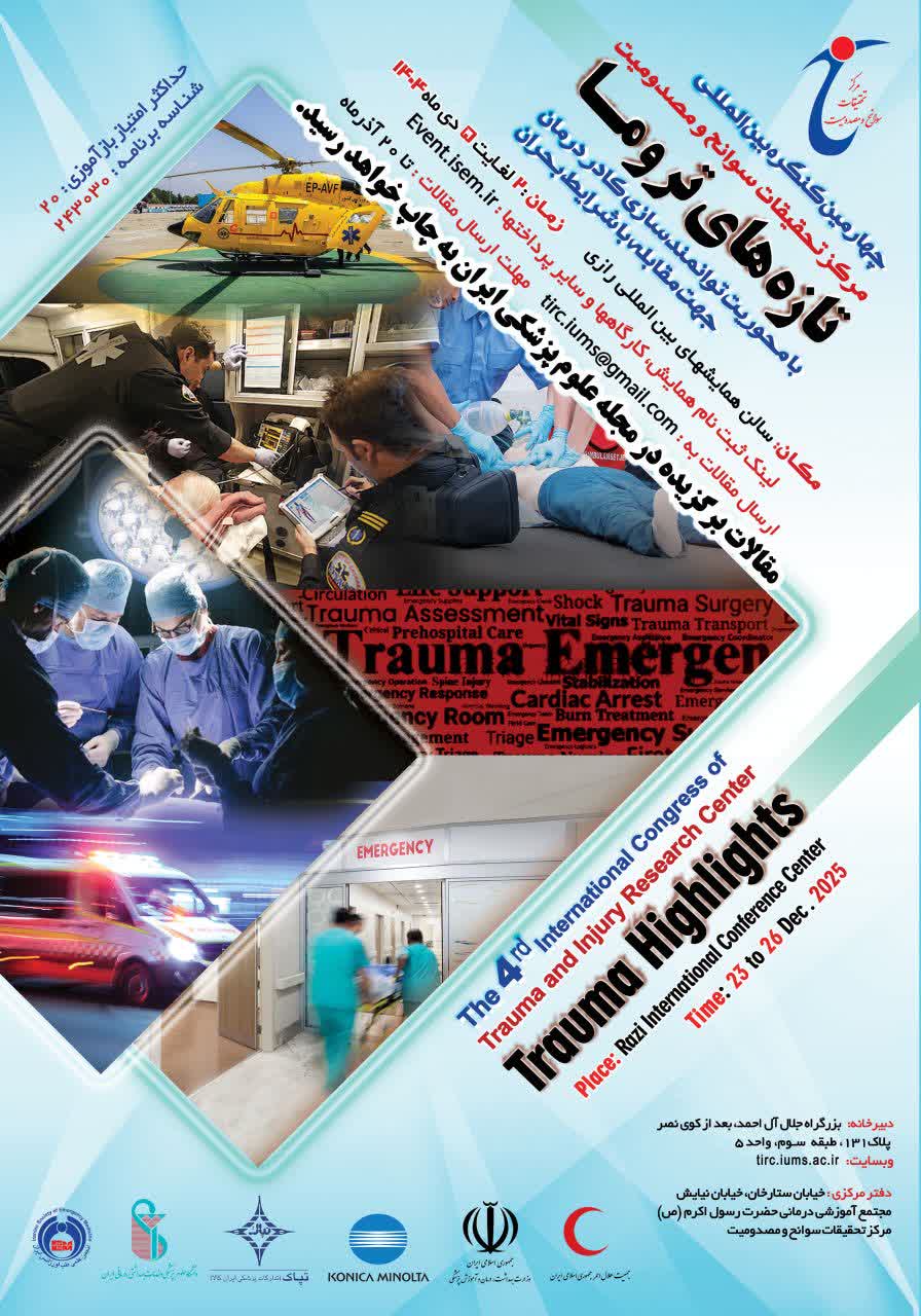 هجدهمین کنگره سالیانه طب اورژانس ایران؛ چهارهمین کنگره تازه های تروما و کنگره پرستاری اورژانس در عصر تحول دیجیتال در روزهای 2 تا 5 دی 1404، در سالن همایش های رازی دانشگاه علوم پزشکی ایران برگزار می شود.