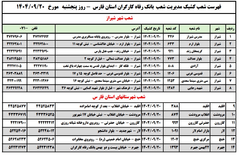 فهرست شعب کشیک بانک رفاه کارگران استان فارس در روز 20 آذر