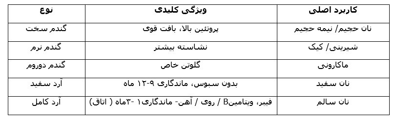 گندم بر اساس سختی و میزان پروتئین به دو گروه اصلی تقسیم می شود؛ «گندم سخت» که برای تهیه نان های حجیم و نیمه حجیم مناسب است و «گندم نرم» که بیشتر در شیرینی و کیک کاربرد دارد؛ گندم دوروم نیز که عمدتاً برای تولید ماکارونی استفاده می شود، به دلیل ترکیب متفاوت پروتئین و گلوتن، ساختار و عملکرد پخت خاص خود را دارد.